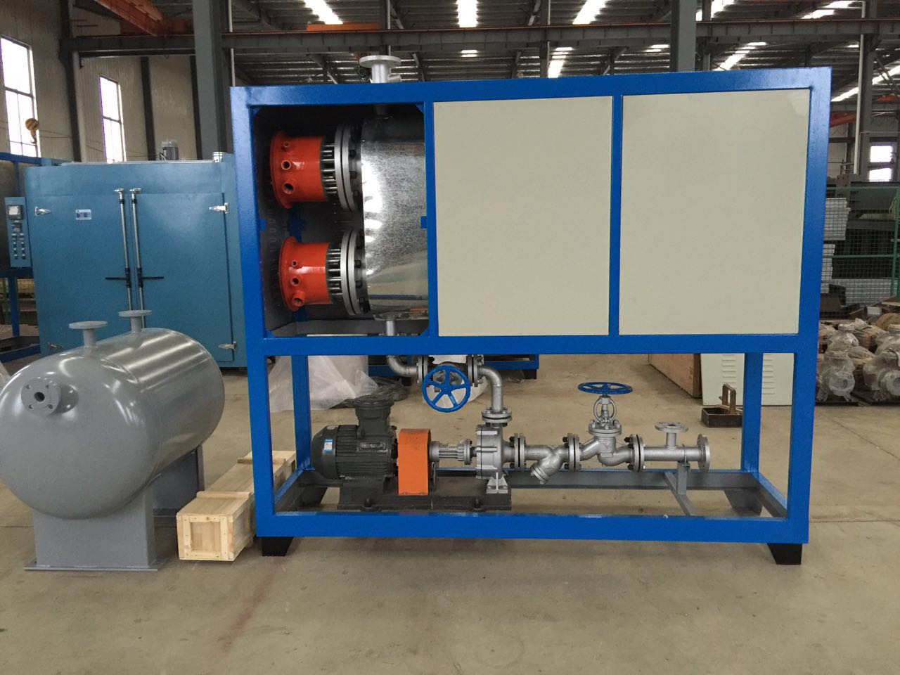 導(dǎo)熱油爐排氣流程: 1、導(dǎo)熱油通過膨脹槽注油口處加注,并通過膨脹口管道流入設(shè)備及油爐本體內(nèi),此時注油時一定要打開系統(tǒng)中所有的閥門(放油閥除外),讓導(dǎo)熱油流入筒體及需加熱設(shè)備內(nèi)。 2、當液面顯示約為膨脹槽高度1/2時,停止注油。 3、首 行常溫排氣:接通電源,打開導(dǎo)熱油加熱器的進出口閥門及排氣閥(膨脹管道閥門需一直開著以及時補充油量),按動油泵啟動按鈕,油泵運行,油泵應(yīng)按箭頭指示方向正常運行,壓力表壓力顯示在規(guī)定范圍內(nèi),視聽油泵運行情況,如有異常現(xiàn)象應(yīng)立即停機檢查,將故障排除后再重新起動油泵,進行常溫下排氣,直至壓力表指示穩(wěn)定。進行常溫排氣時,要注意觀察膨脹槽內(nèi)的液位,當?shù)陀谝?guī)定的液位高度時要及時進行補充。 4、升溫脫水:在確認常溫下運行正常后,即可進行升溫脫水排氣(操作前詳閱導(dǎo)熱油使用說明書及溫控儀使用說明書),升溫脫水排氣可按如下步驟進行: 步:升溫至100-120℃保溫 開始升溫時,應(yīng)該控制升溫速度在50℃/h以內(nèi),并且監(jiān)視壓力表顯示是否正常,如發(fā)現(xiàn)無壓力或壓力不穩(wěn),說明系統(tǒng)內(nèi)仍有殘留氣體,此時要求按3要求重復(fù)進行常溫排氣操作,待系統(tǒng)壓力穩(wěn)定后方可繼續(xù),升溫至120℃后進行長時間保溫,保溫時間的長短與系統(tǒng)總?cè)萘考皩?dǎo)熱油的質(zhì)量有關(guān)。  第二步:升溫至150-180℃保溫。  排除油中輕組分、揮發(fā)物及殘余水分,請參照KRD系列導(dǎo)熱油加熱器系統(tǒng)脫水排氣曲線圖操作 第三步:脫水排氣完成后要關(guān)閉排氣閥(其它閥門無需關(guān)閉),投入正常升溫運行。 5、 升溫脫水排氣過程有關(guān)事項。 升溫過程中管路可能會發(fā)出碰擊的響聲,說明系統(tǒng)內(nèi)有大量氣體或管道不暢,此時要降低升溫速度,待氣體排除便可消除聲響;如系管道不暢所至應(yīng)予以排除。 脫水排氣過程可能會有大量氣體涌入膨脹槽,造成槽內(nèi)導(dǎo)熱油外溢,操作前要在溢油管下安置好溢油容器。 進行脫水排氣時,現(xiàn)場必須有人員看守,發(fā)現(xiàn)異常及時處理。   對于所提的油泵無油或少許油流出的問題,解決方案如下: 1、 關(guān)閉出油口閥門,啟動油泵,觀察壓力表顯示情況,若無壓力,則說明回油口無油補充油泵,使得油泵空轉(zhuǎn),無后續(xù)油及時補充,則請貴司檢查一下回油口的供油情況,此時請確保膨脹槽里有油并膨脹管道閥門打開和需熱設(shè)備有油并出油口閥門在打開狀態(tài)。 2、 如果以上要求都執(zhí)行到位,壓力表還無壓力,請檢查油爐上的油泵、截止閥及過濾器是否堵塞。 3、 若壓力表顯示壓力值,而油泵、截止閥及過濾器并無堵塞,那油爐的出油口一定會按油泵所提供的流量進行流出。